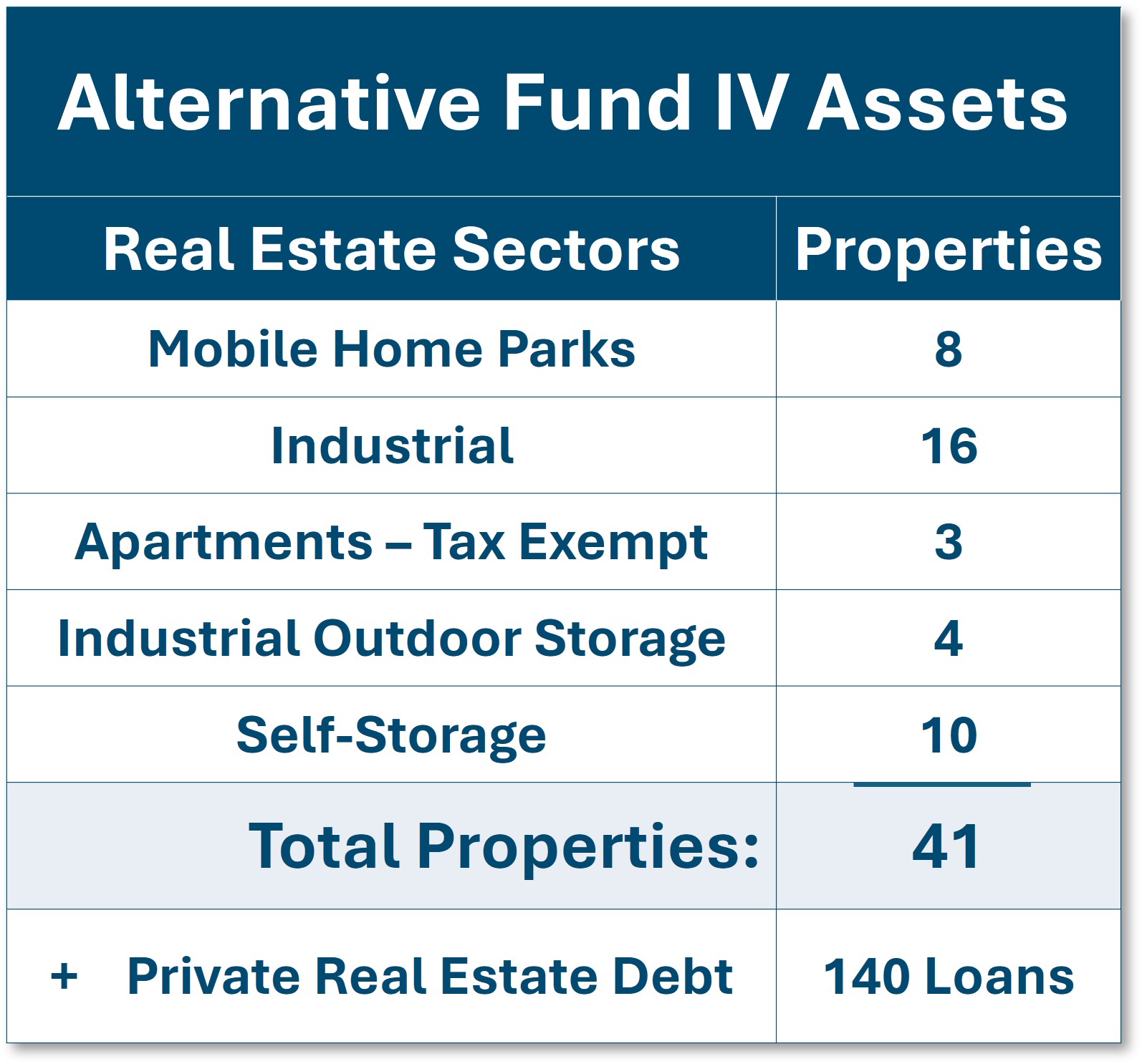 The Fund invests across resilient asset classes including industrial, mobile home parks, self-storage, apartments, and private real estate debt, working with top-tier operating partners nationwide.